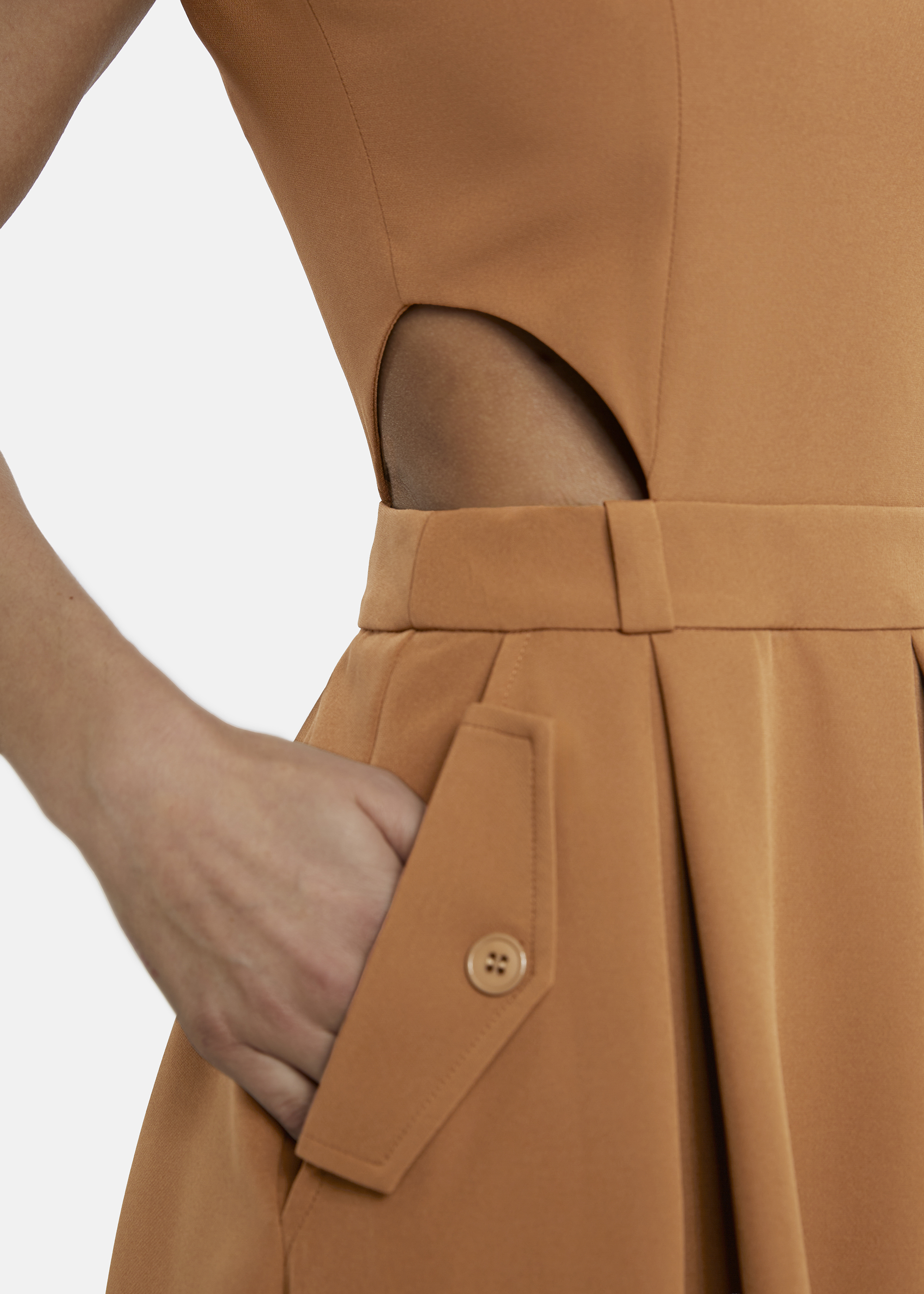 The BALLOWI midi dress in a trench-style design impresses with its modern, tailored cut and high-quality twill fabric that provides an elegant structure. Sleeveless in design, it combines a classic business look with a feminine silhouette. The pockets and wide, swinging pleated skirt add lightness and movement to the dress. Cut-outs at the waist create subtle highlights and accentuate the silhouette.