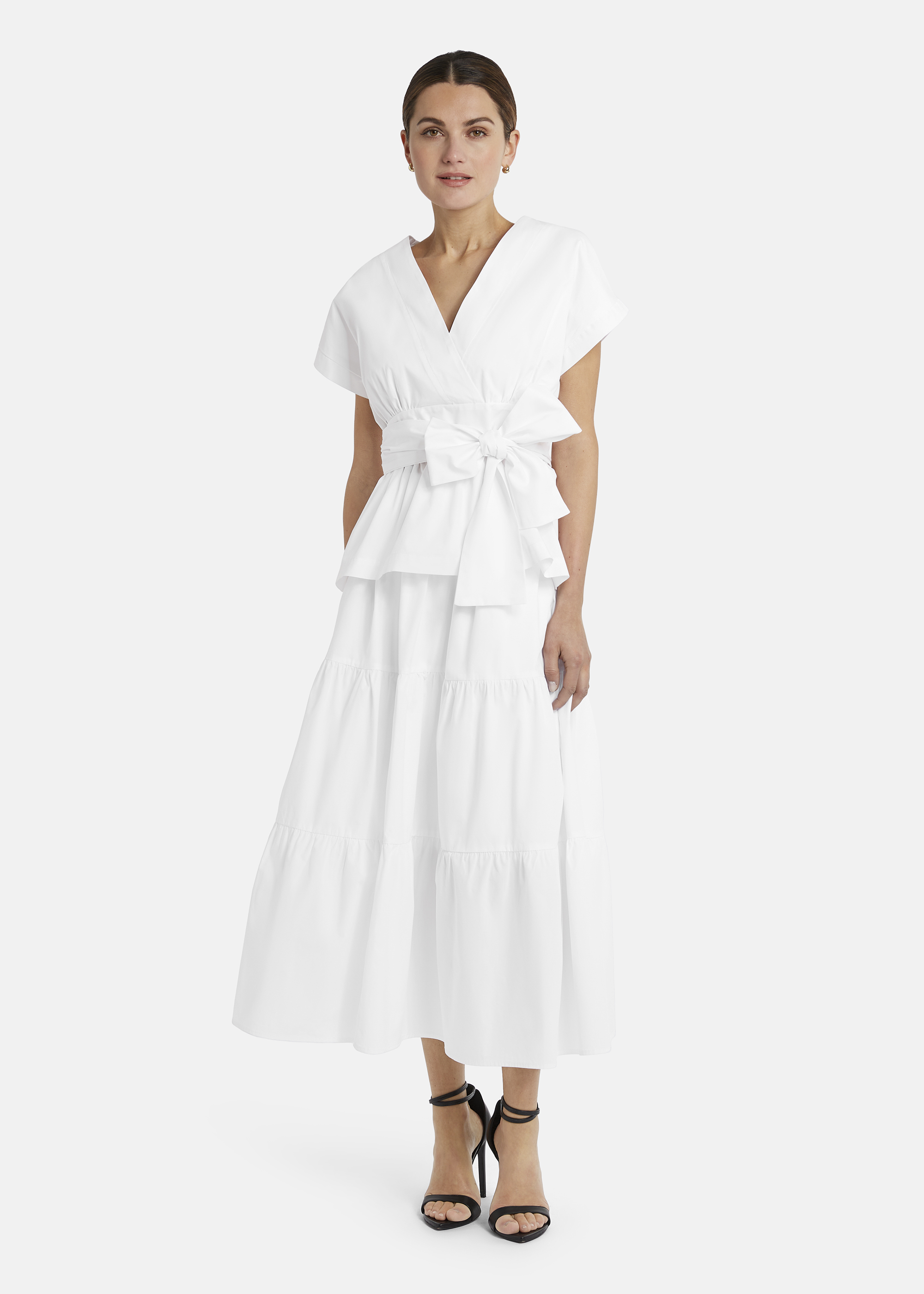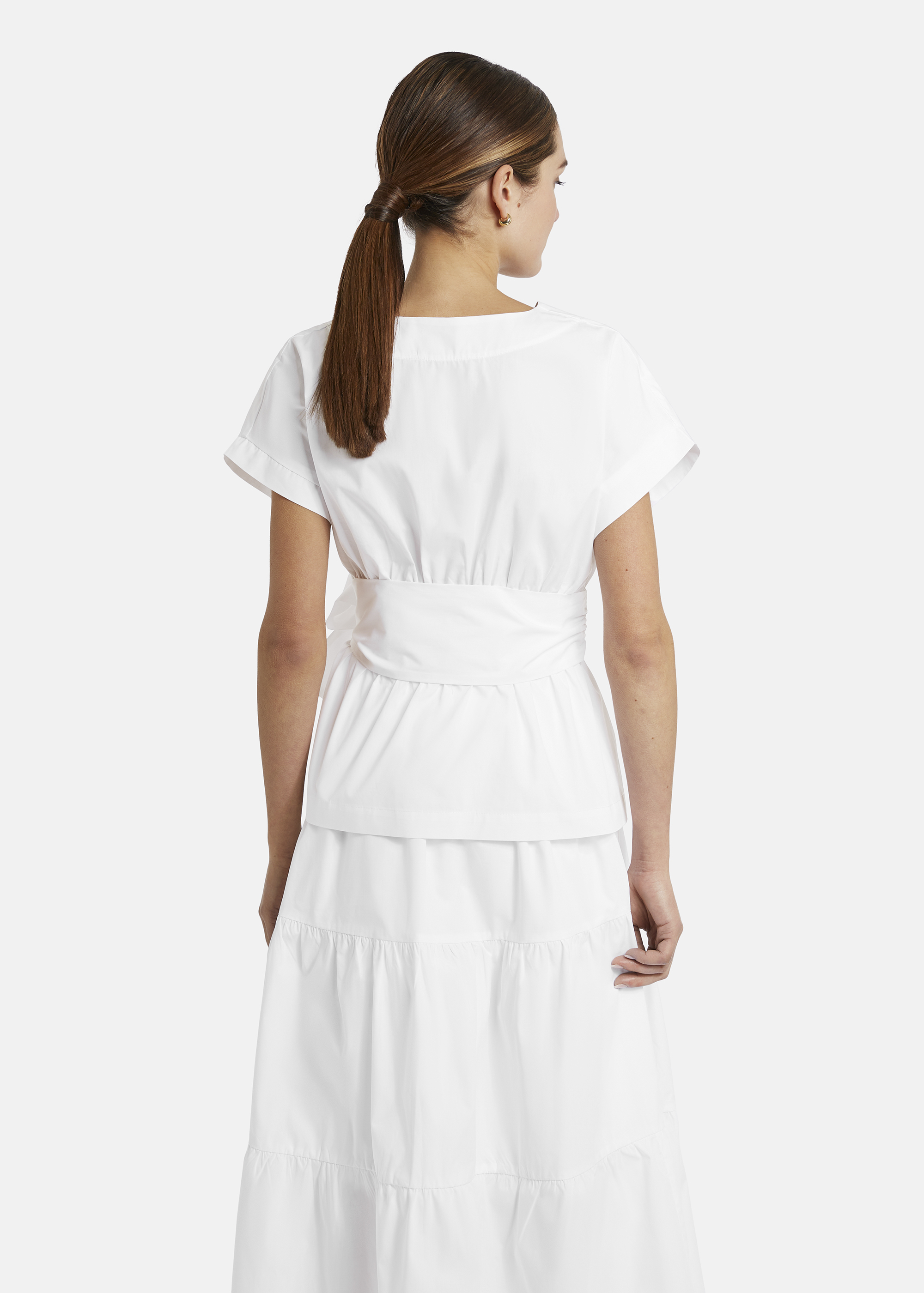 The CANIWA wrap-style blouse top is an ideal summer essential—casual yet elegant thanks to its distinctive cut. The tie belt and peplum accentuate the waist, creating a natural, feminine silhouette. A concealed side zip ensures an optimal fit, while the breathable cotton poplin offers a light and comfortable feel. Paired with the CANIWO ruffled skirt, it forms a refined, high-quality set.