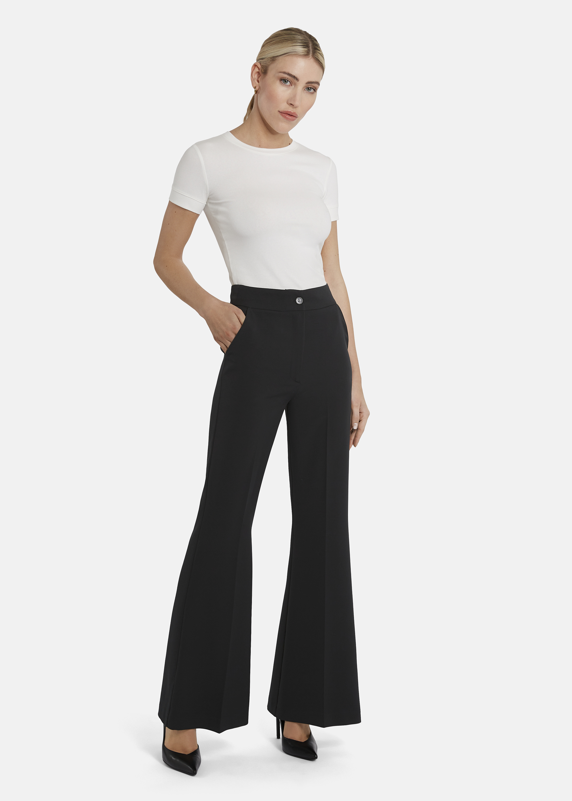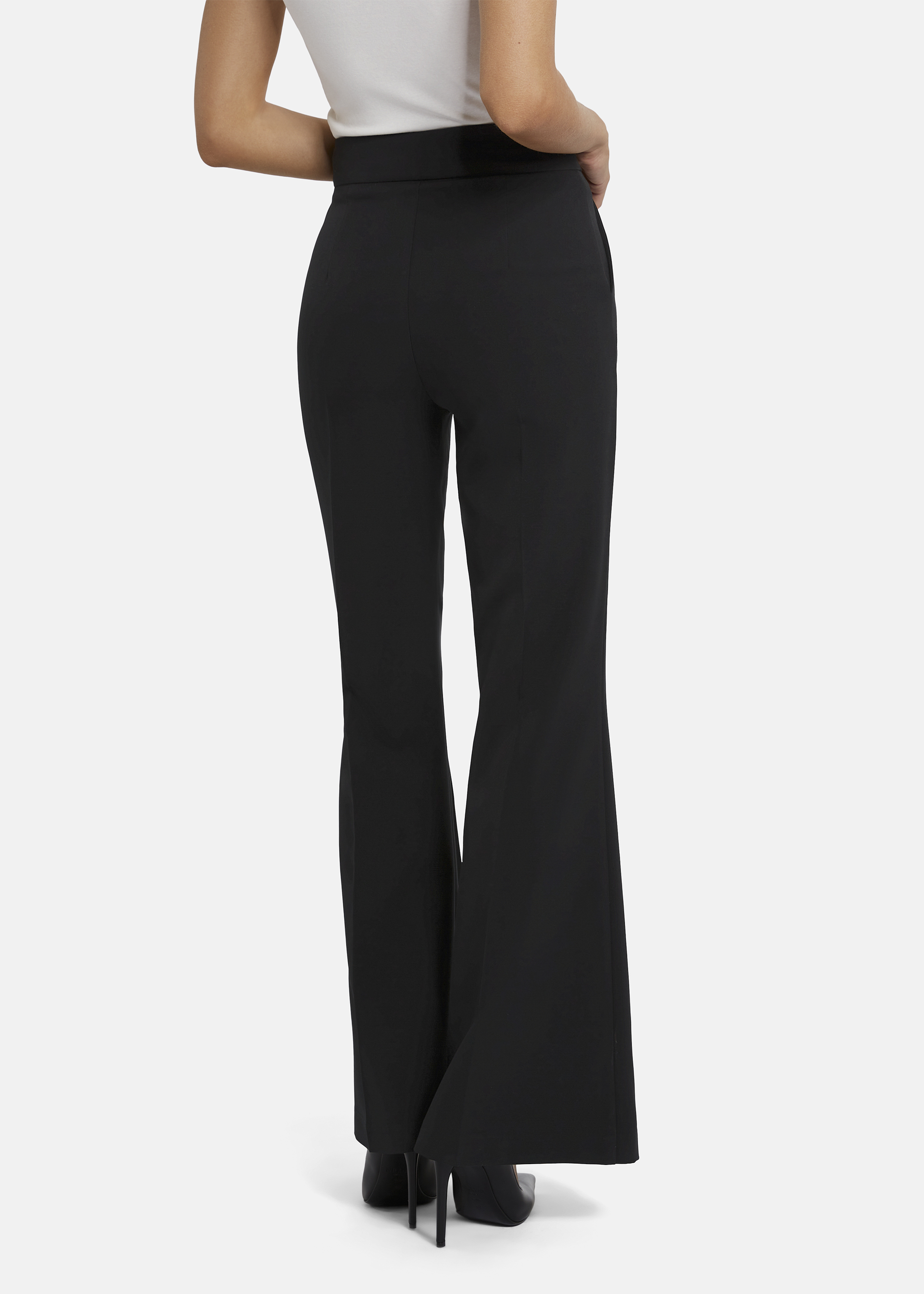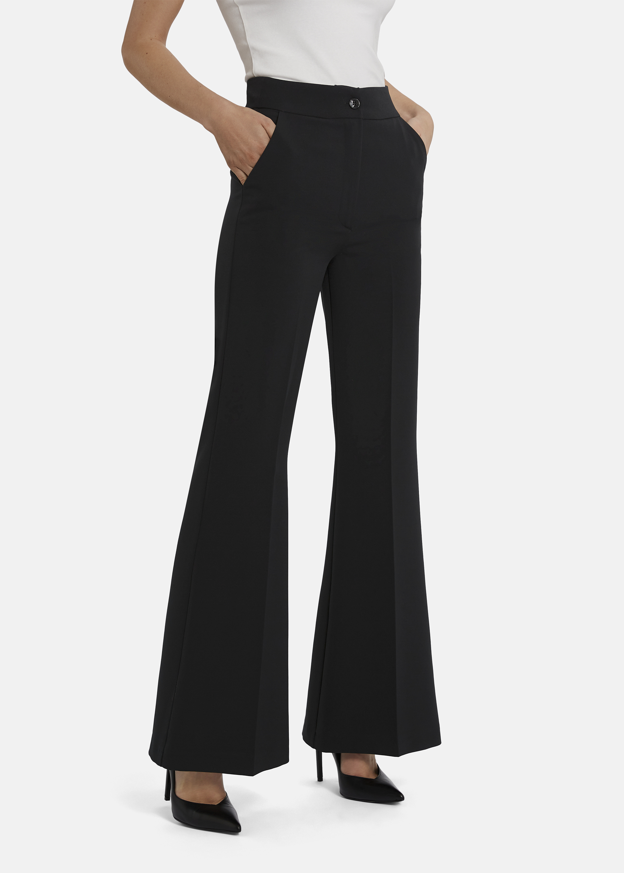 The CORIWI pleated trousers with flared, long legs pair perfectly with high heels. A modern take on 70s flair meets an elegant business silhouette—the pronounced flare creates a fashionable, striking look. An Italian statement piece for a confident appearance.